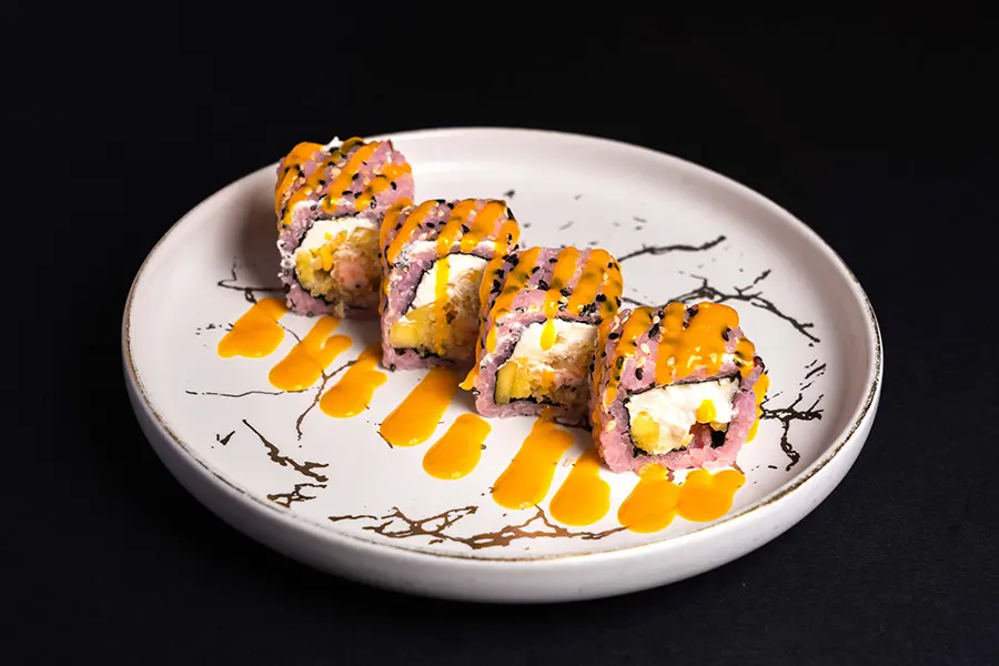 Tempura shrimp, cucumber, and avocado dance alongside sweet mango slices, drizzled with a tangy mango sauce.
